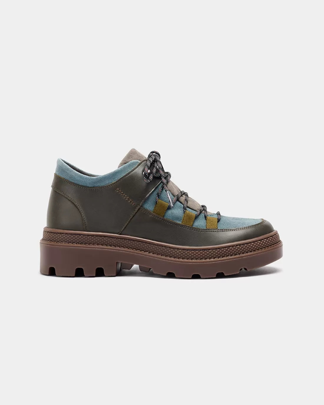 Abra is a flat boot inspired by mountain footwear. The uppers are a combination of cow leather, split suede and fabric. Thick track sole made of TR. Laces in contrasting colour. Fabric lining. Removable foam insole. The total height is 3.5 cm for greater back comfort.