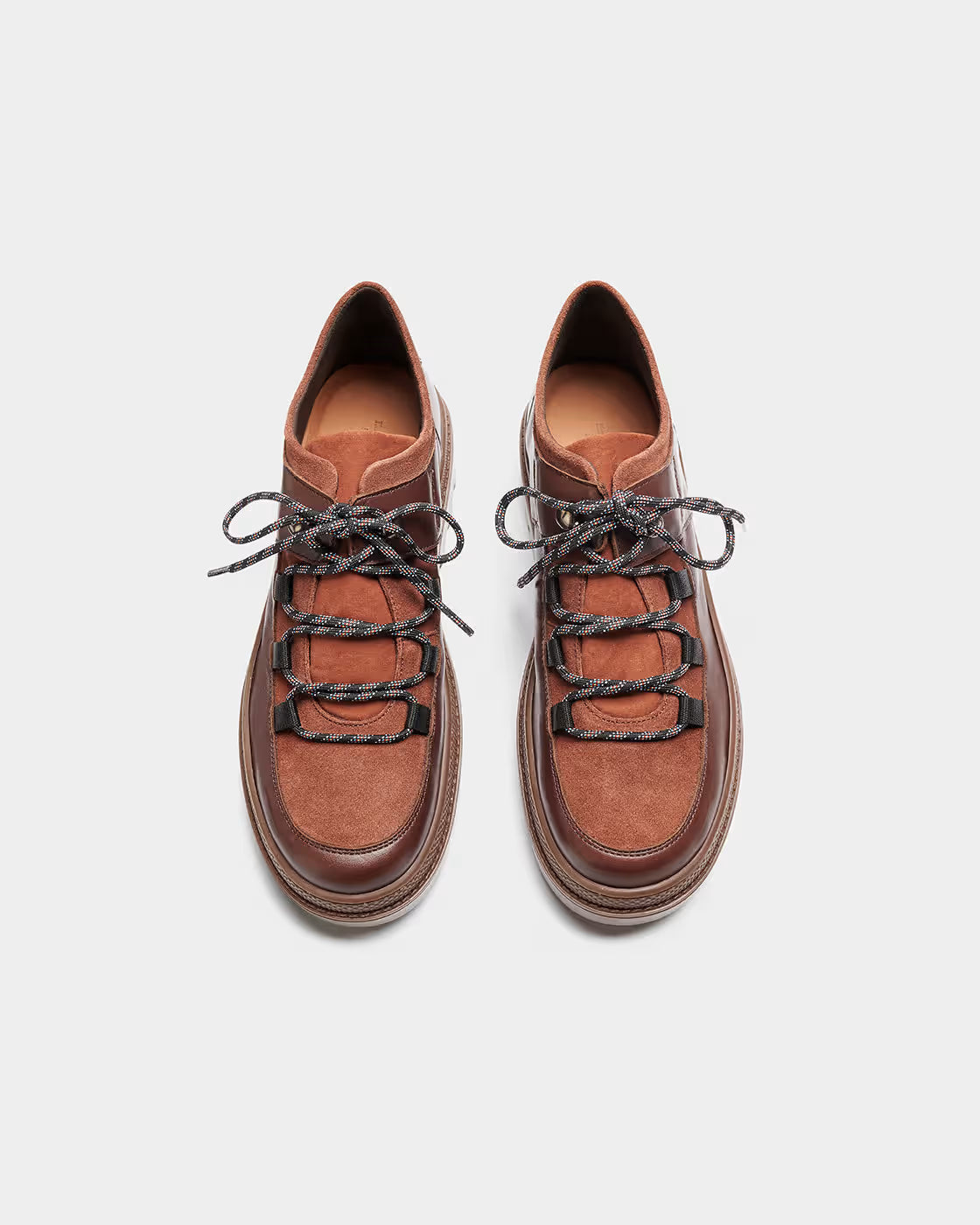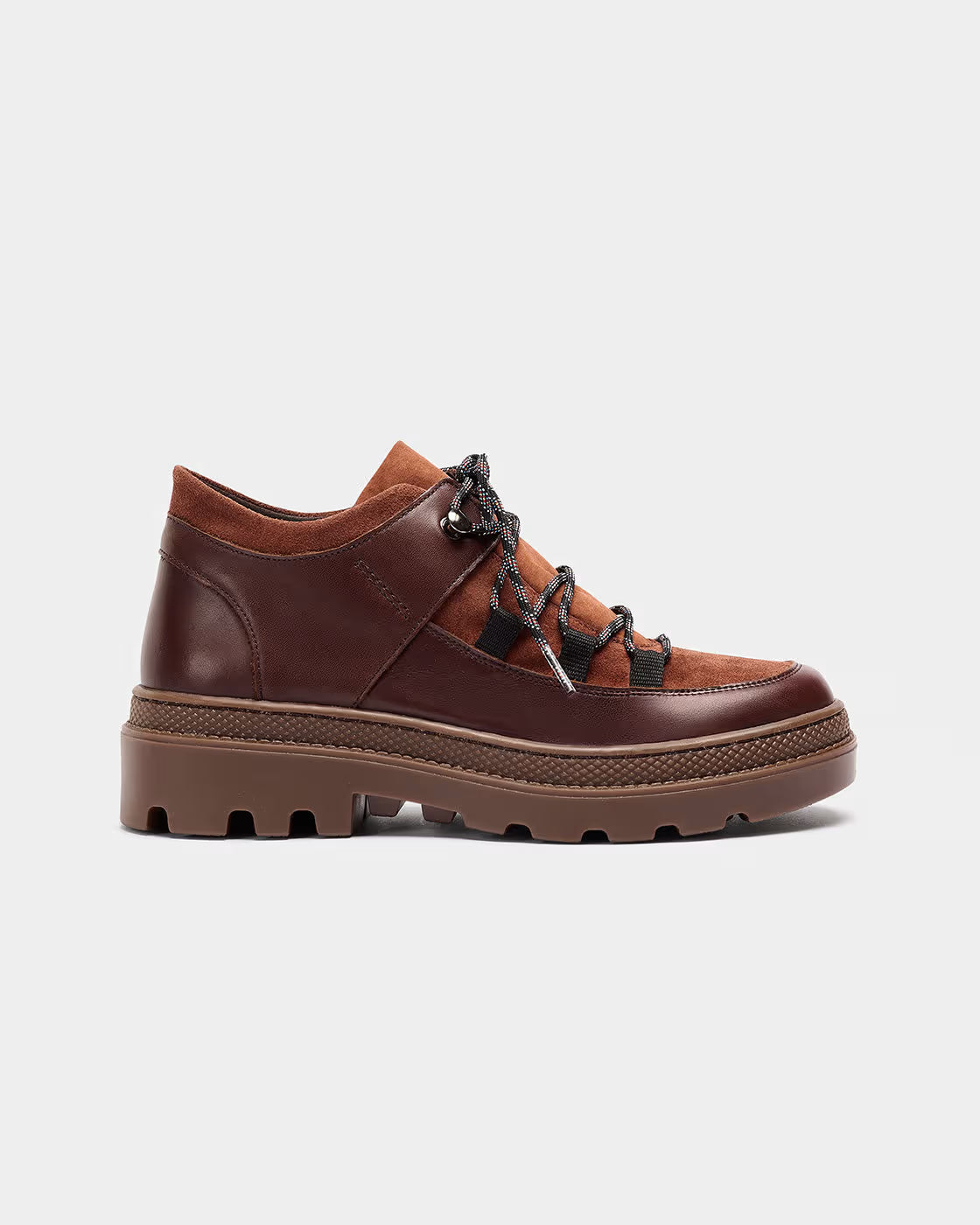 Abra is a flat boot inspired by mountain footwear. The uppers are a combination of cow leather, split suede and fabric. Thick track sole made of TR. Laces in contrasting colour. Fabric lining. Removable foam insole. The total height is 3.5 cm for greater back comfort.