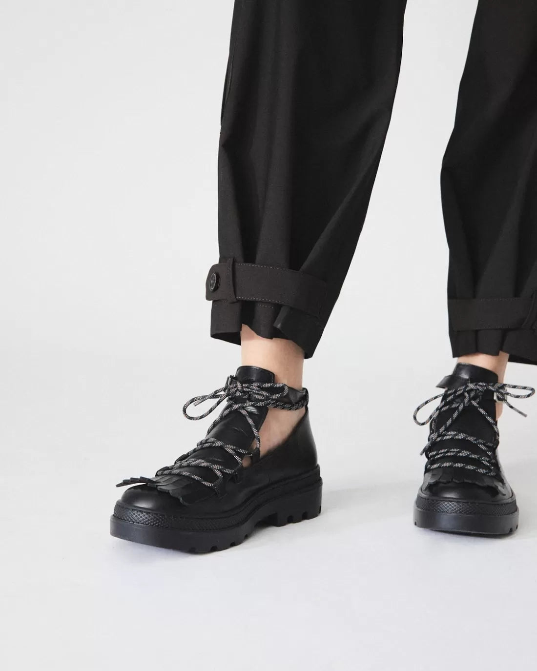 MUZ is an open shoe inspired by mountain footwear. The upper is made of cowhide leather. Thick TR track sole. Metal buckle closure at ankle. Contrast color lacing detail at instep. Fabric lining. Removable foam insole. Sole height is 3.5 cm for back comfort.